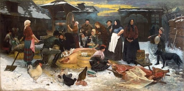 A nagy nap előestéjén volt nagy sürgés-forgás! Anyám előszedegette az edényeket: teknőket húsnak, szalonnának, tálat a vérnek, késeket, lapítódeszkákat*, aztán a fűszereket, darabos sót a szalonnára, hagymát, fokhagymát, tormát… Jaj, csak nehogy kimaradjon valami! Megfőzte a rizst a májasba, mert akkor nem lesz annak is hely a kályhán, apám a köményest vegyítette kevés vaníliával bolondítva, kóstoltatta, elég erős-e. Aztán a csűrből szalmát dobott le a perzseléshez, még egyszer megnézte az áldozatot, megvakargatta a füle tövét. Mi, gyermekek újságpapírokat teregettünk a szőnyegre.
