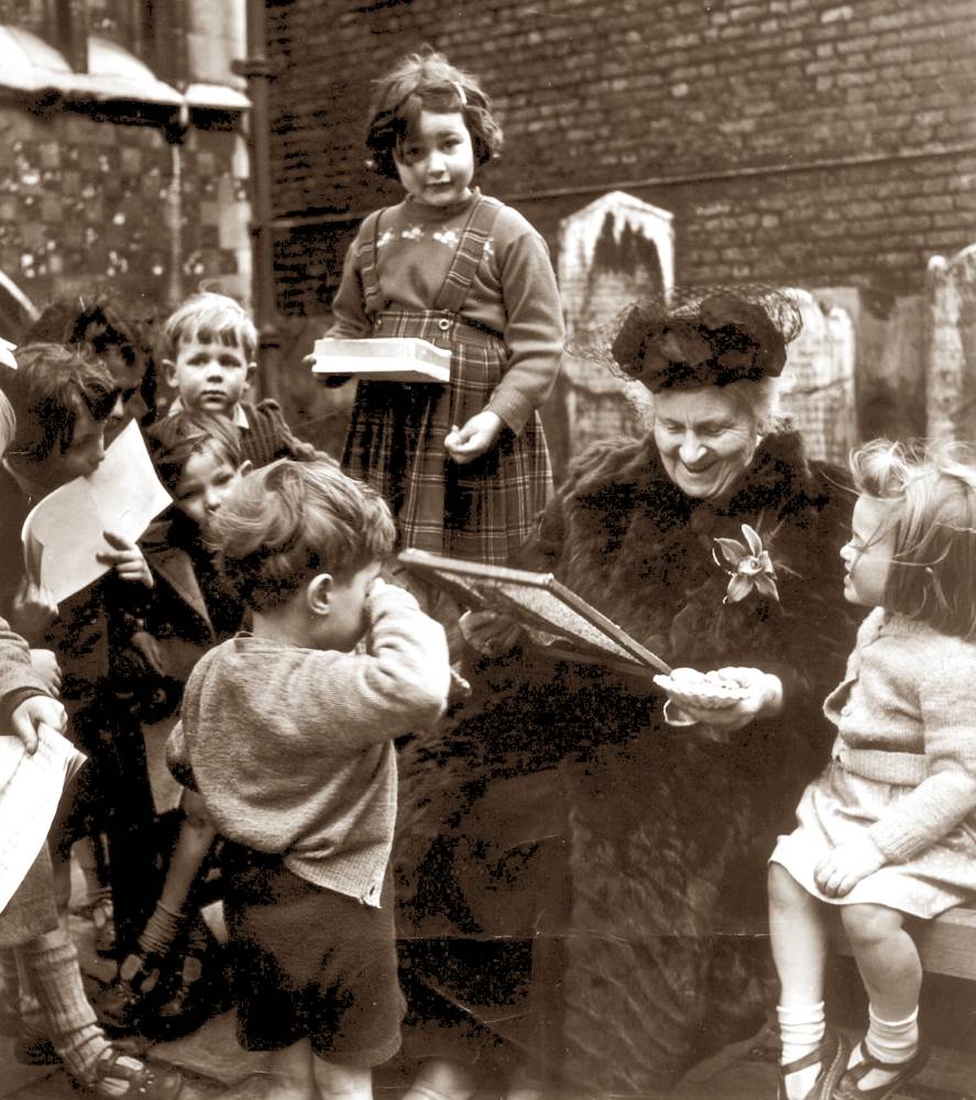 Maria Montessori a londoni Gatehouse School diákjaival utolsó angliai látogatásakor, 1951-ben.