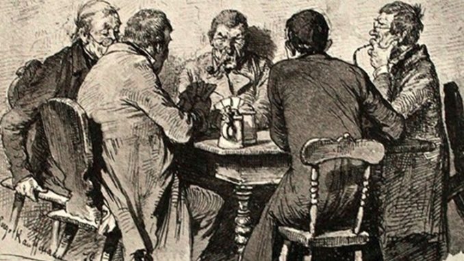 A szobában vágni lehet a sodort, tokos stb. cigaretták, szivarok füstjét. A gyerekek és az asszony a konyhába, udvarra menekülnek. A nem nagy asztalon halmokban áll az aprópénz. Van, akinél szétterítve, akad, akinél az érmék értéke szerinti, takaros oszlopokba rakva. Néhány papírpénz is előkerül a tárcából, a farzsebből, esetleg a mellényzsebből.
